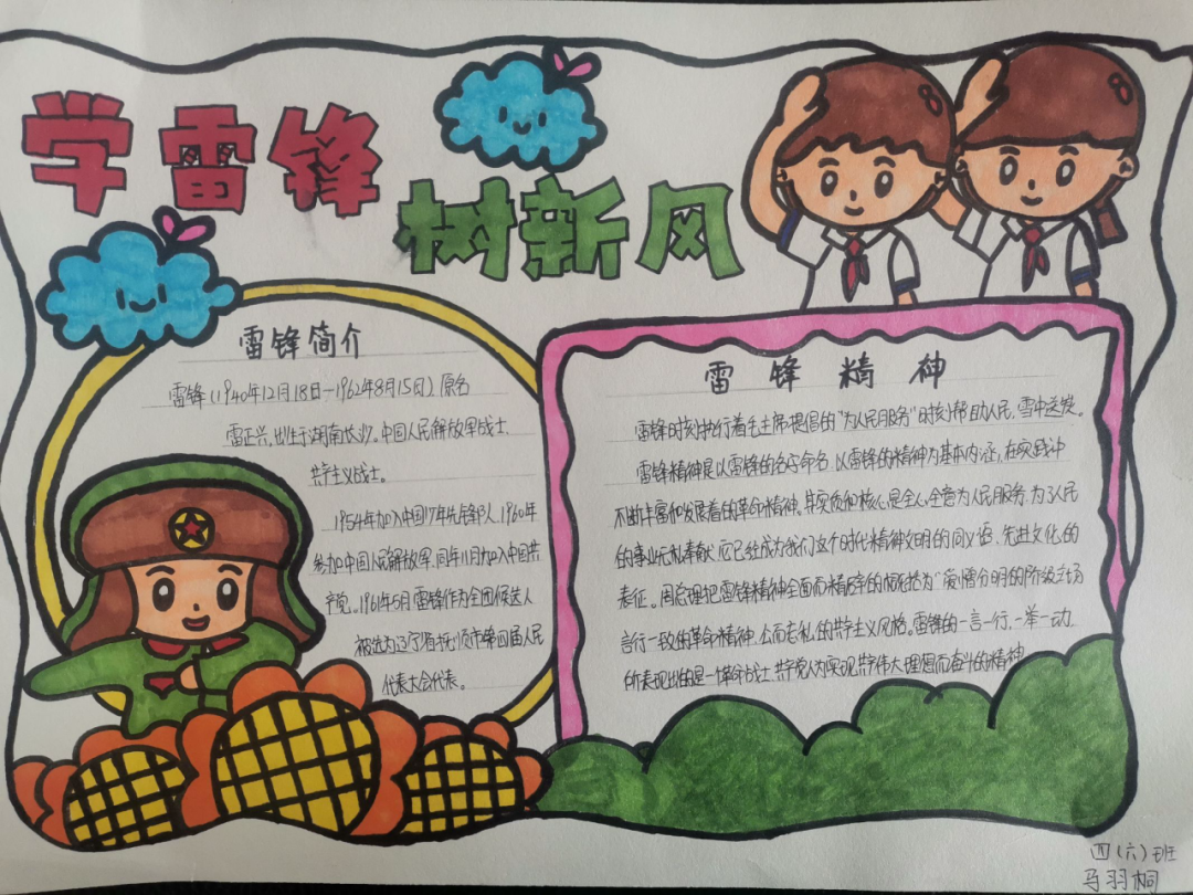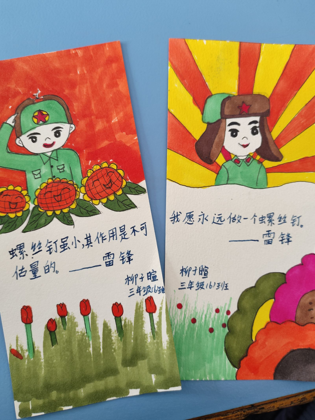 学生们在老师的指导下积极行动起来“绘”雷锋。他们 执起画笔,用缤纷的线条展现着心中的雷锋形象,用绚丽的色彩描绘着雷锋精神。一笔一画,都蕴含着队员们对雷锋深深的崇敬之情。孩子们还精心制作了创意十足的书签。一枚枚小书签上,振奋人心的雷锋语录传递着雷锋精神,指引着队员们成为充满正能量的新时代少年。